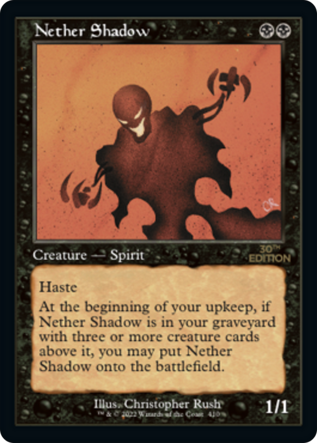 Haste At the beginning of your upkeep, if Nether Shadow is in your graveyard with three or more creature cards above it, you may put Nether Shadow onto the battlefield.