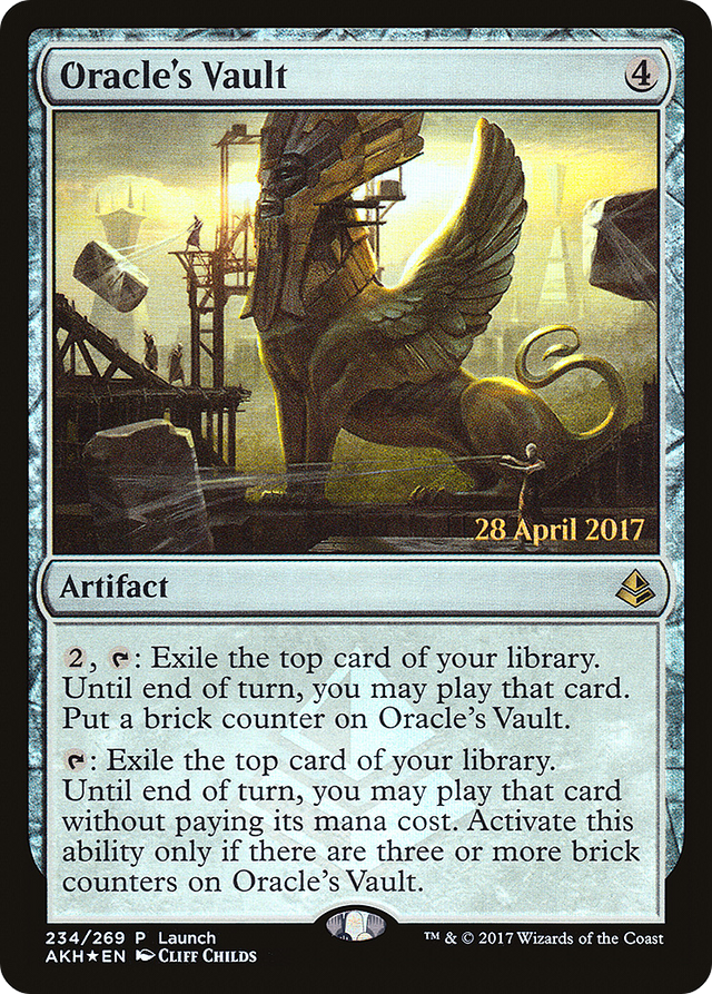 {2}, {T}: Exile the top card of your library. Until end of turn, you may play that card. Put a brick counter on Oracle's Vault.