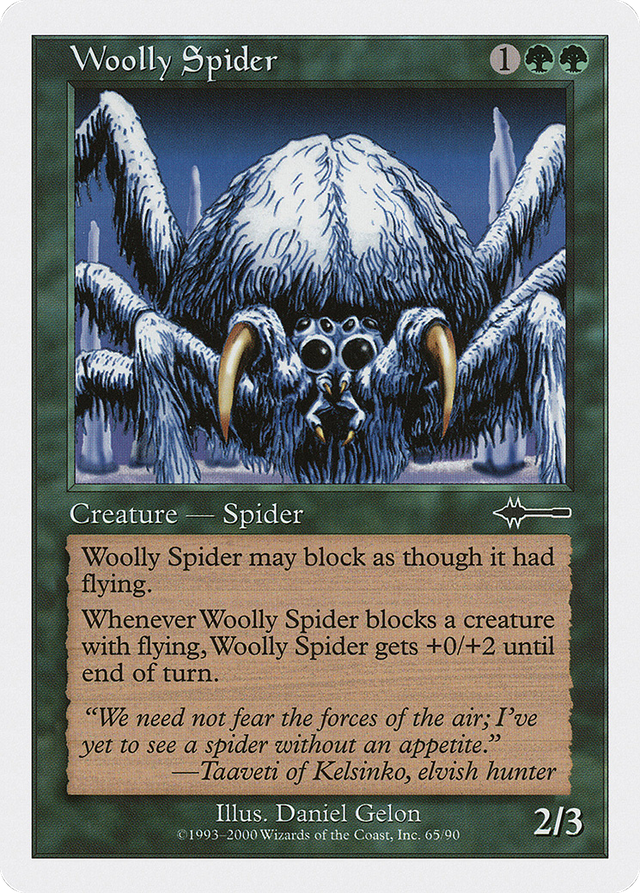Whenever Woolly Spider blocks a creature with flying, Woolly Spider gets +0/+2 until end of turn.