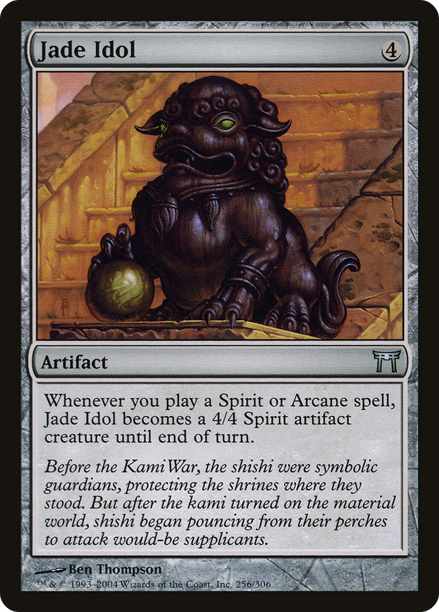 Whenever you cast a Spirit or Arcane spell, Jade Idol becomes a 4/4 Spirit artifact creature until end of turn.