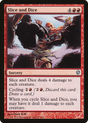 Slice and Dice deals 4 damage to each creature. Cycling {2}{R} ({2}{R}, Discard this card: Draw a card.) When you cycle Slice and Dice, you may have it deal 1 damage to each creature.