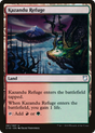 Kazandu Refuge enters the battlefield tapped. When Kazandu Refuge enters the battlefield, you gain 1 life. {T}: Add {R} or {G}.