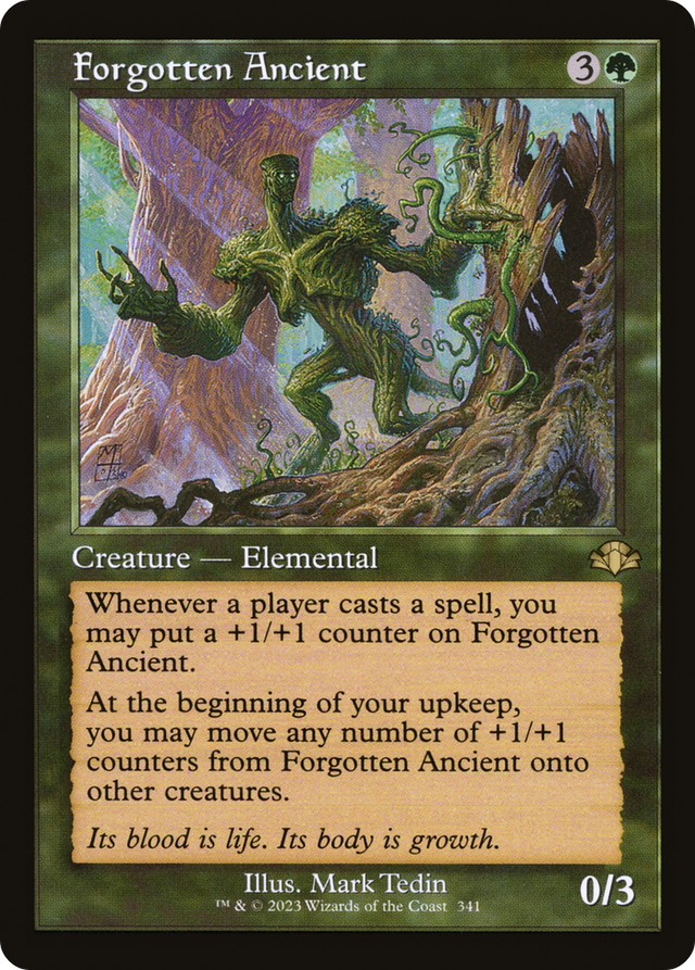 Whenever a player casts a spell, you may put a +1/+1 counter on Forgotten Ancient. At the beginning of your upkeep, you may move any number of +1/+1 counters from Forgotten Ancient onto other creatures.