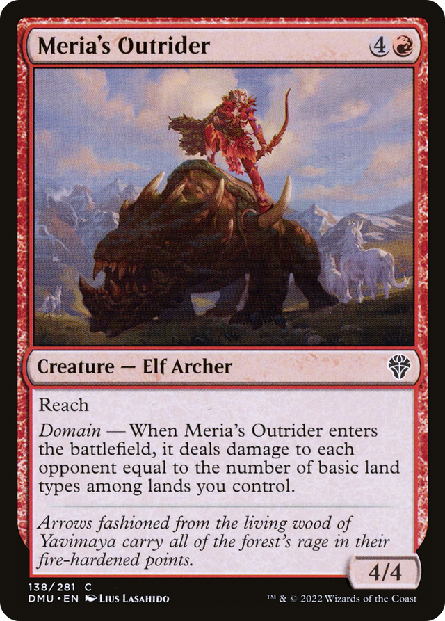 Reach Domain — When Meria's Outrider enters the battlefield, it deals damage to each opponent equal to the number of basic land types among lands you control.