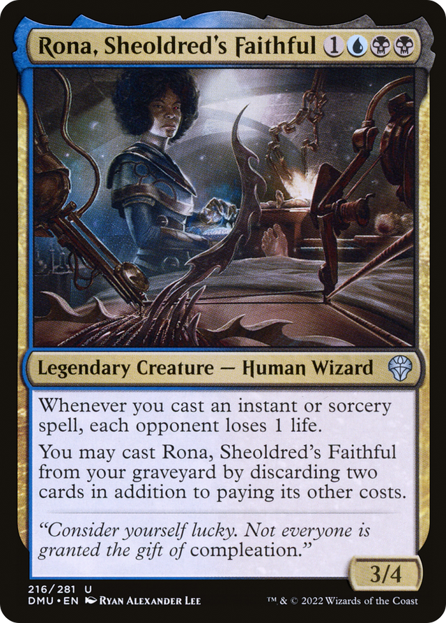 Whenever you cast an instant or sorcery spell, each opponent loses 1 life. You may cast Rona, Sheoldred's Faithful from your graveyard by discarding two cards in addition to paying its other costs.