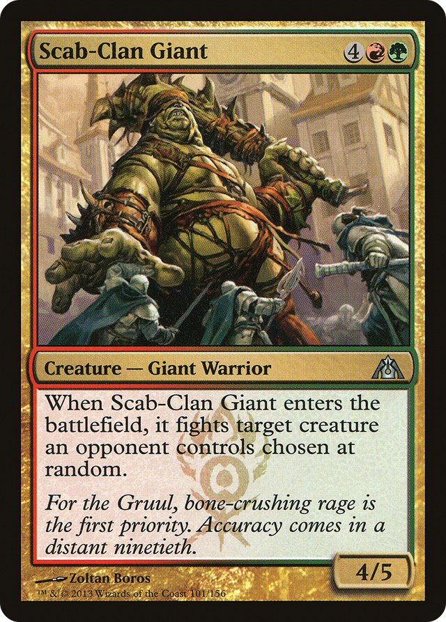 When Scab-Clan Giant enters the battlefield, it fights target creature an opponent controls chosen at random.