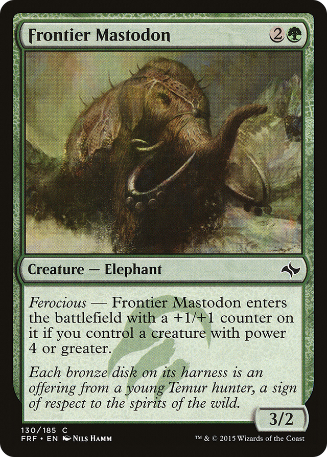 Ferocious — Frontier Mastodon enters the battlefield with a +1/+1 counter on it if you control a creature with power 4 or greater.
