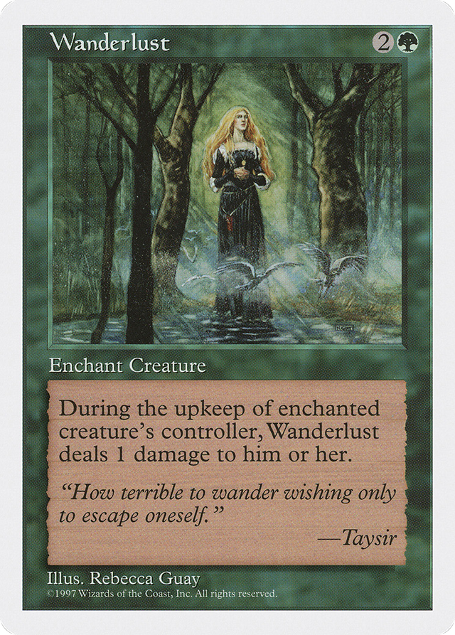 At the beginning of the upkeep of enchanted creature's controller, Wanderlust deals 1 damage to that player.