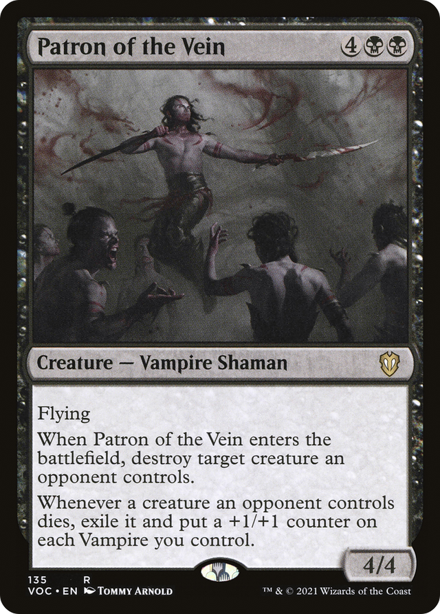 Flying When Patron of the Vein enters the battlefield, destroy target creature an opponent controls. Whenever a creature an opponent controls dies, exile it and put a +1/+1 counter on each Vampire you control.