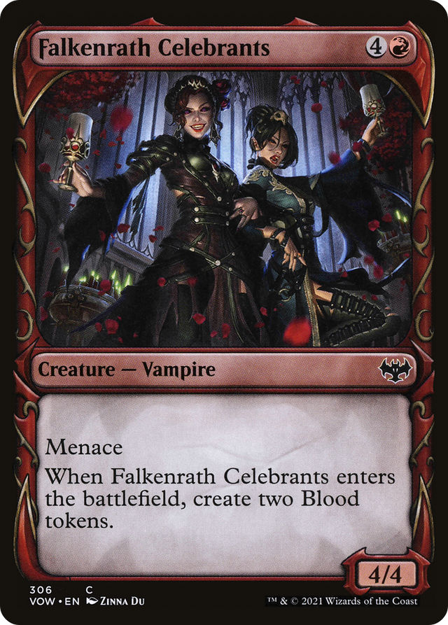 When Falkenrath Celebrants enters the battlefield, create two Blood tokens. (They're artifacts with "{1}, {T}, Discard a card, Sacrifice this artifact: Draw a card.")