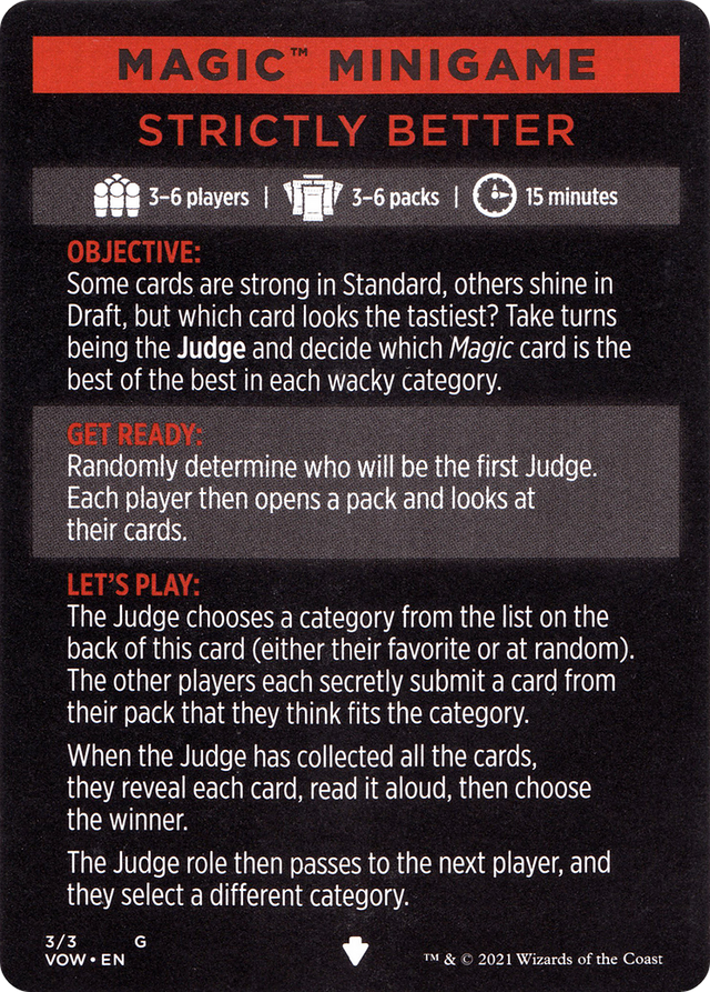 3-6 players | 3-6 packs | 15 minutes OBJECTIVE: Some cards are strong in Standard, others shine in Draft, but which card looks the tastiest? Take turns being the Judge and decide which Magic card is the best of the best in each wacky category. GET READY: Randomly determine who will be the first Judge. Each player then opens a pack, removes any cards without Magic backs, and looks at their cards. LET'S PLAY: The Judge chooses a category from the list on the back of this card (either their favorite or at random). The other players each secretly submit a card from their pack that they think fits the category. When the Judge has collected all the cards, they reveal each card, read it aloud, then choose the winner. The Judge role then passes to the next player, and they select a different category. // TO WIN: The first player to win three categories is the winner! CATEGORIES: 1. Best vacation spot 2. First pick in Draft 3. Grossest 4. Cutest 5. Shiniest 6. Best rock band name 7. Most likely to eat a hedron 8. Best party leader 9. Most inept 10. Coolest treasure 11. Most heroic 12. Most likely to split the party 13. Loudest 14. The next Planeswalker 15. The next fad diet 16. Best mystery novel title 17. Best birthday gift 18. Best win condition 19. Worst weather 20. Worst way to die 21. Best flavor text 22. Best dinner date 23. Most likely to steal your date 24. Best dressed 25. Tastiest 26. Hottest 27. Biggest 28. Smallest 29. Most dangerous job 30. Dream job 31. Most colorful 32. Colossal Dreadmaw's dinner 33. Last picked in dodgeball 34. Best pet