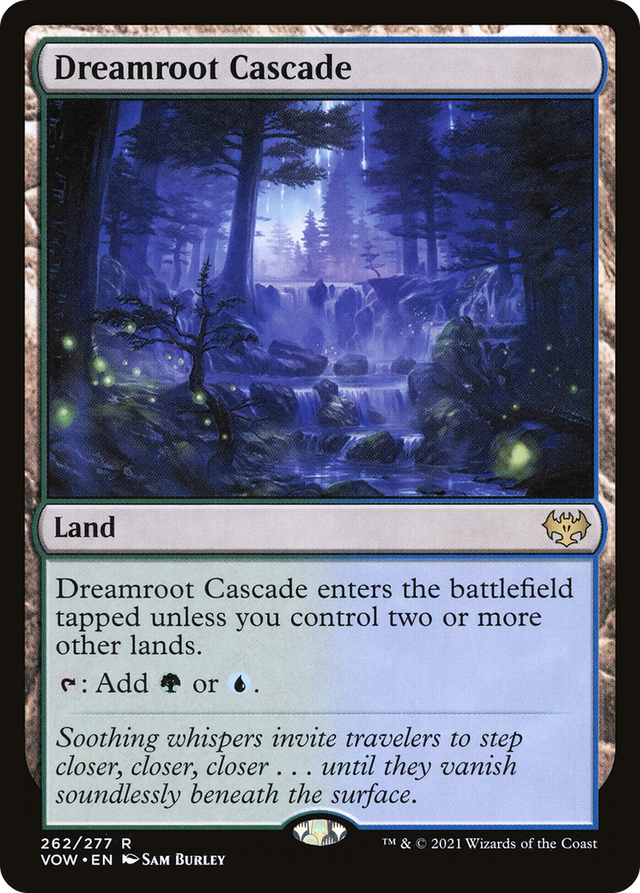 Dreamroot Cascade enters the battlefield tapped unless you control two or more other lands.
