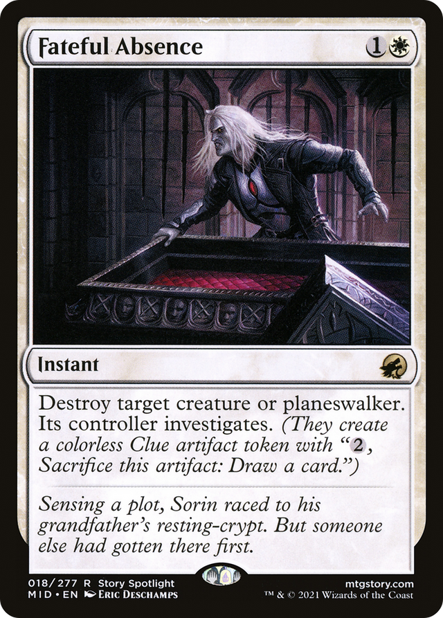 Destroy target creature or planeswalker. Its controller investigates. (Create a Clue token. It's an artifact with "{2}, Sacrifice this artifact: Draw a card.")