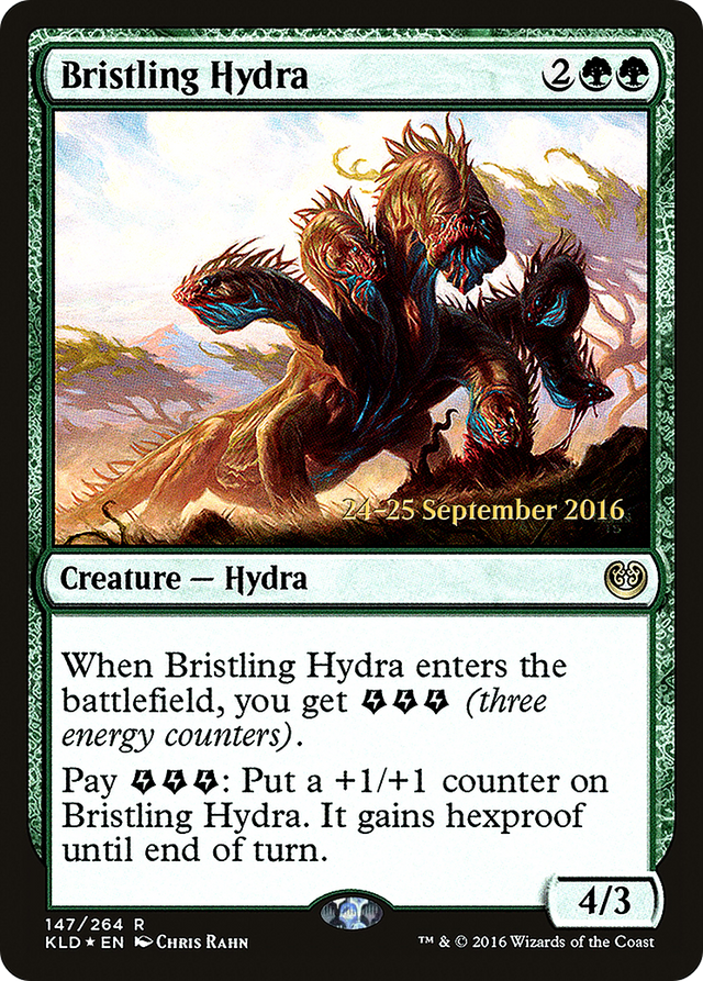 When Bristling Hydra enters the battlefield, you get {E}{E}{E} (three energy counters).