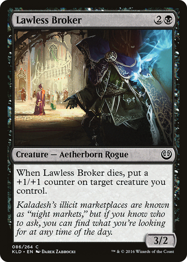 When Lawless Broker dies, put a +1/+1 counter on target creature you control.