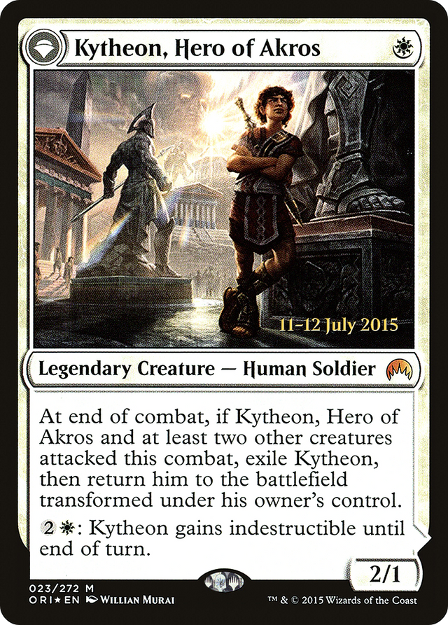 At end of combat, if Kytheon, Hero of Akros and at least two other creatures attacked this combat, exile Kytheon, then return him to the battlefield transformed under his owner's control.
