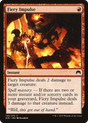 Spell mastery — If there are two or more instant and/or sorcery cards in your graveyard, Fiery Impulse deals 3 damage instead.