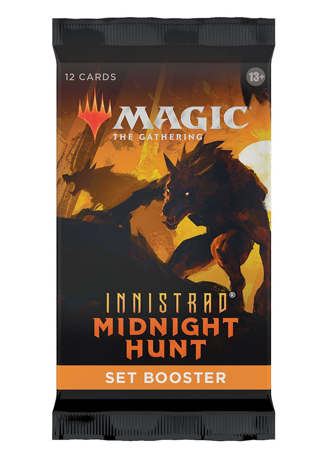 Each Innistrad: Midnight Hunt Set Booster contains a combination of 1–4 Rares and/or Mythic Rares, 2–7 Uncommons, 3–8 Commons, and 1 Eternal Night Full-Art Basic Land card. One non–Art Card and non–Land card of any rarity is a traditional foil. A foil-stamped Signature Art Card replaces the Art Card in 5% of Set Boosters, and a card from The List replaces the token or ad card in 25% of Set Boosters.