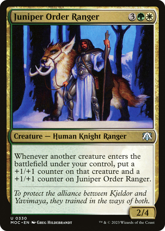 Whenever another creature enters the battlefield under your control, put a +1/+1 counter on that creature and a +1/+1 counter on Juniper Order Ranger.