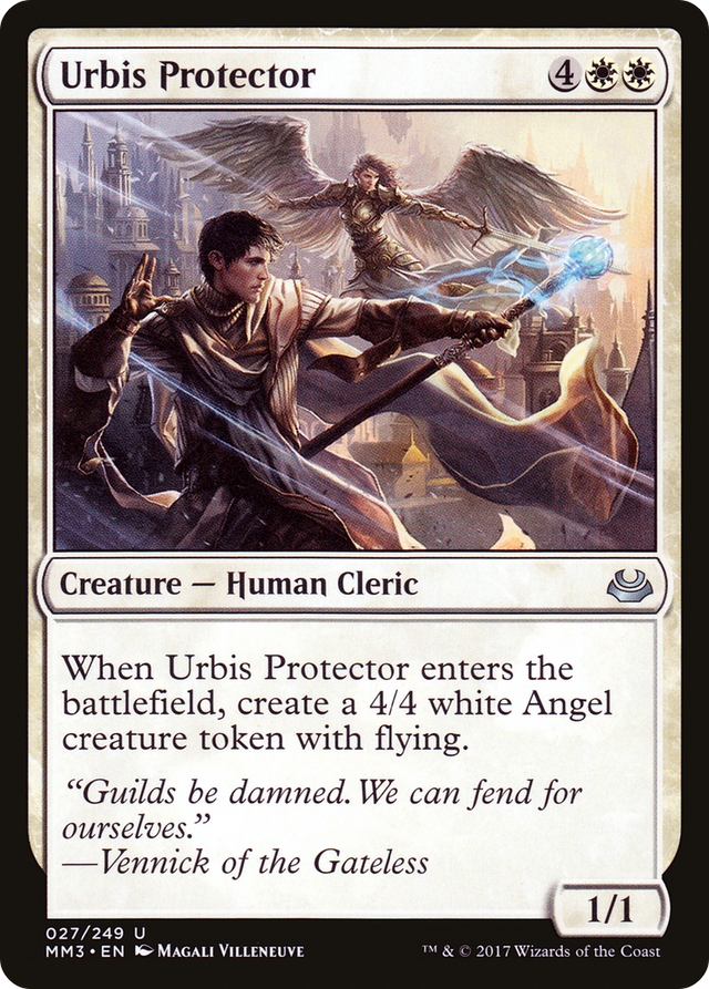 When Urbis Protector enters the battlefield, create a 4/4 white Angel creature token with flying.