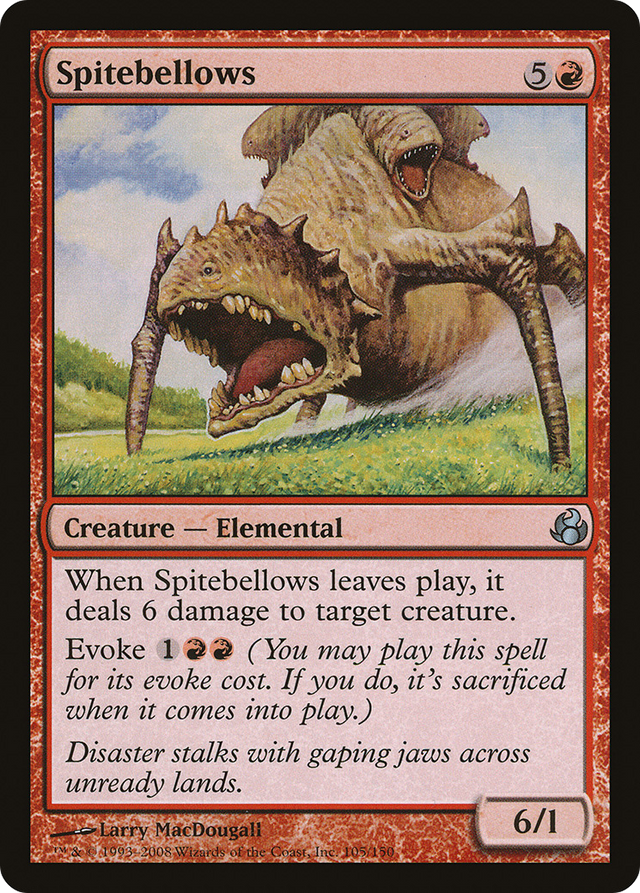 When Spitebellows leaves the battlefield, it deals 6 damage to target creature. Evoke {1}{R}{R} (You may cast this spell for its evoke cost. If you do, it's sacrificed when it enters the battlefield.)