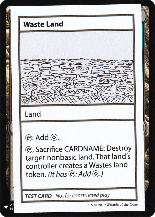{T}, Sacrifice Waste Land: Destroy target nonbasic land. That land's controller creates a Wastes token. (It's a land with {T}: Add {C}.)
