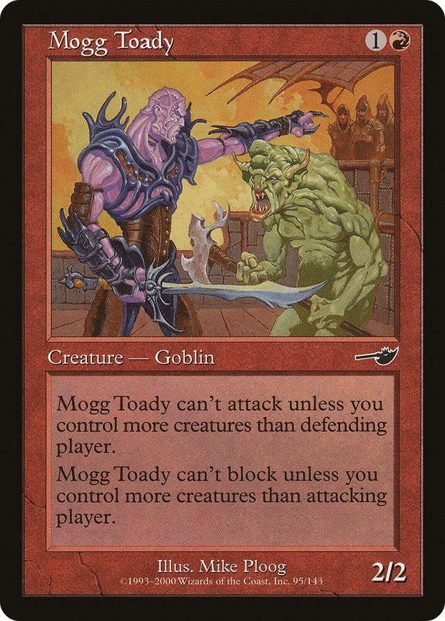 Mogg Toady can't attack unless you control more creatures than defending player. Mogg Toady can't block unless you control more creatures than attacking player.