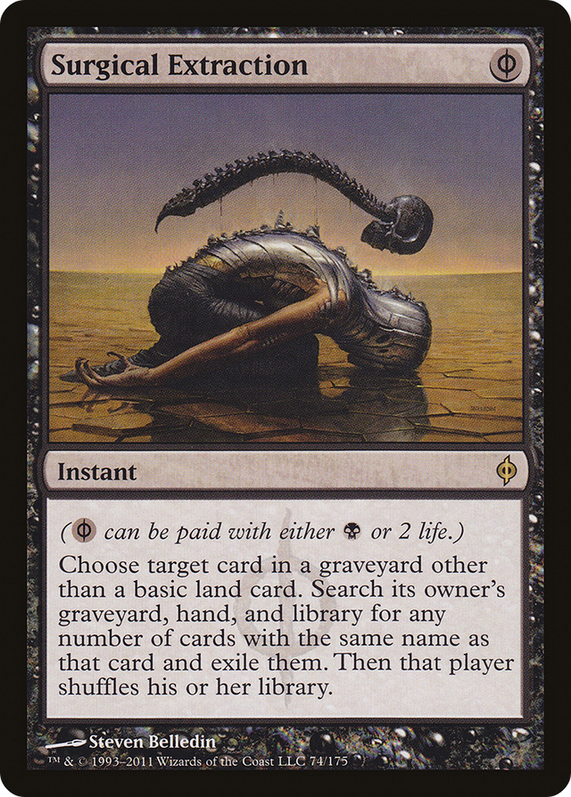 ({B/P} can be paid with either {B} or 2 life.) Choose target card in a graveyard other than a basic land card. Search its owner's graveyard, hand, and library for any number of cards with the same name as that card and exile them. Then that player shuffles.