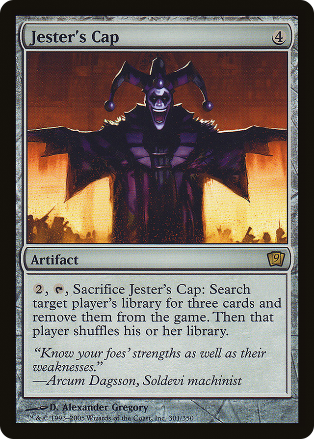 {2}, {T}, Sacrifice Jester's Cap: Search target player's library for three cards and exile them. Then that player shuffles.