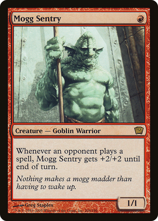 Whenever an opponent casts a spell, Mogg Sentry gets +2/+2 until end of turn.