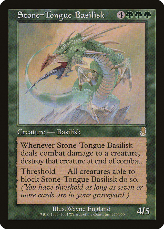 Whenever Stone-Tongue Basilisk deals combat damage to a creature, destroy that creature at end of combat. Threshold — As long as seven or more cards are in your graveyard, all creatures able to block Stone-Tongue Basilisk do so.