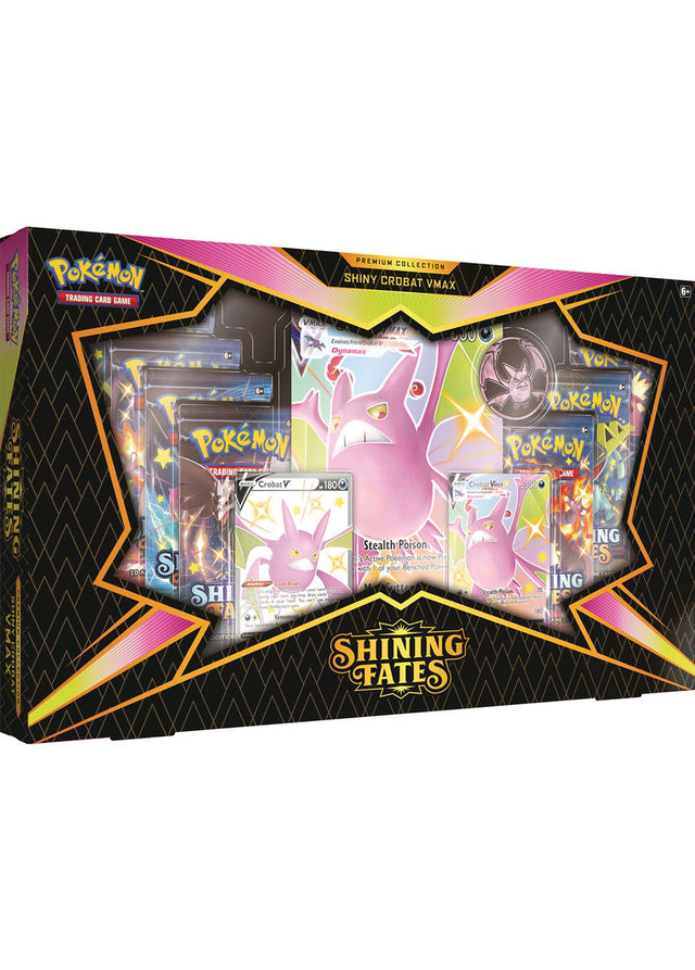 Shining Fates Premium Collections Includes seven Shining Fates booster packs; one foil promo card featuring either Shiny Crobat V or Shiny Dragapult V; one foil promo card and one foil oversize promo card featuring either Shiny Crobat VMAX or Shiny Dragapult VMAX; and one corresponding metallic coin