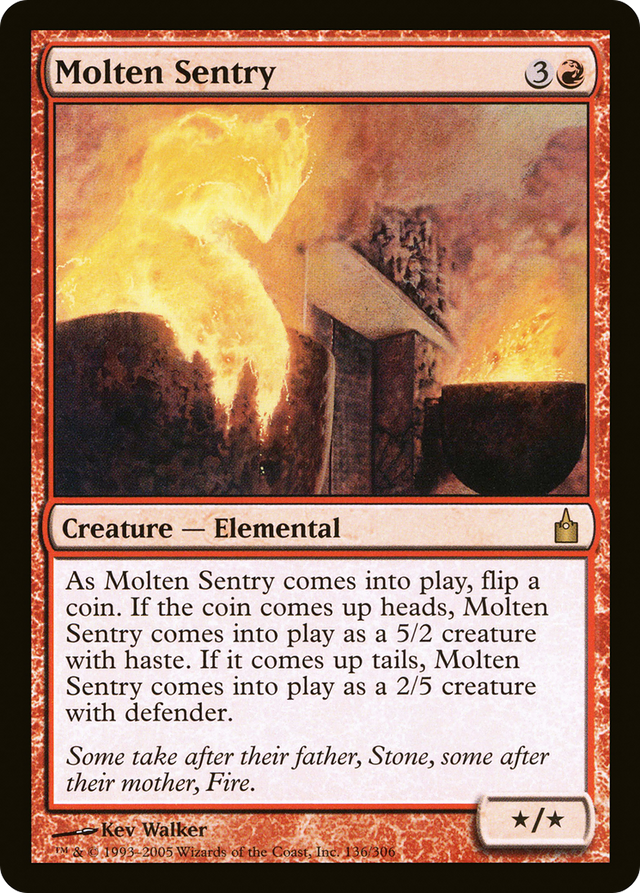 As Molten Sentry enters the battlefield, flip a coin. If the coin comes up heads, Molten Sentry enters the battlefield as a 5/2 creature with haste. If it comes up tails, Molten Sentry enters the battlefield as a 2/5 creature with defender.