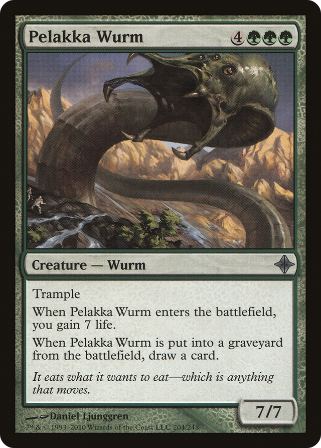 Trample When Pelakka Wurm enters the battlefield, you gain 7 life. When Pelakka Wurm dies, draw a card.