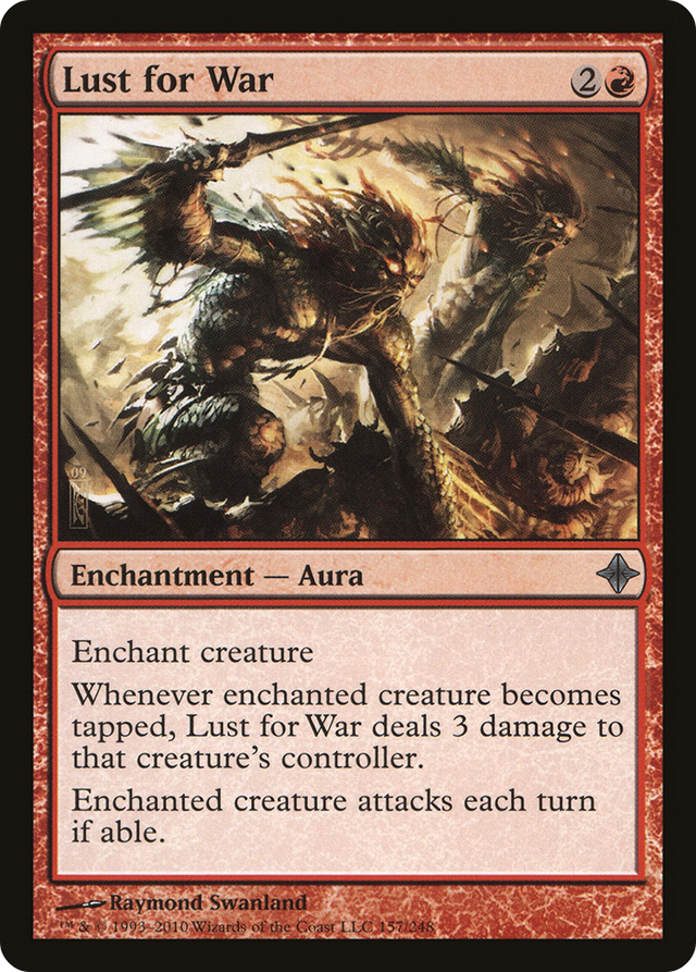 Enchant creature Whenever enchanted creature becomes tapped, Lust for War deals 3 damage to that creature's controller. Enchanted creature attacks each combat if able.