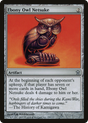 At the beginning of each opponent's upkeep, if that player has seven or more cards in hand, Ebony Owl Netsuke deals 4 damage to that player.