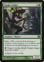 Infect (This creature deals damage to creatures in the form of -1/-1 counters and to players in the form of poison counters.) {G}: Target creature blocks Tangle Angler this turn if able.