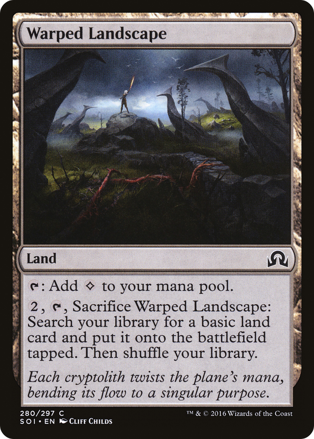 {T}: Add {C}. {2}, {T}, Sacrifice Warped Landscape: Search your library for a basic land card, put it onto the battlefield tapped, then shuffle.