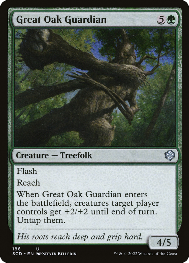 When Great Oak Guardian enters the battlefield, creatures target player controls get +2/+2 until end of turn. Untap them.