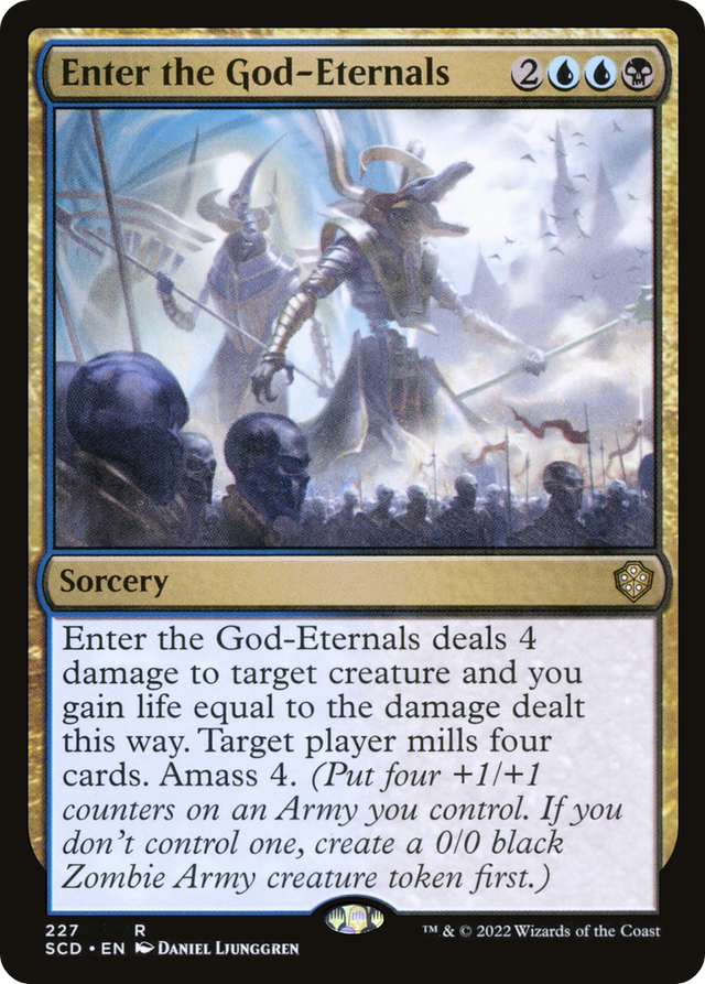 Enter the God-Eternals deals 4 damage to target creature and you gain life equal to the damage dealt this way. Target player mills four cards. Amass Zombies 4. (Put four +1/+1 counters on an Army you control. It's also a Zombie. If you don't control an Army, create a 0/0 black Zombie Army creature token first.)