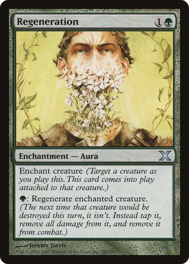 {G}: Regenerate enchanted creature. (The next time that creature would be destroyed this turn, it isn't. Instead tap it, remove all damage from it, and remove it from combat.)
