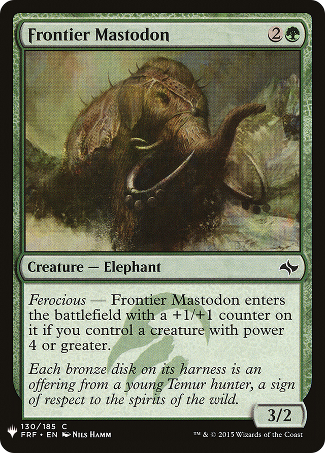 Ferocious — Frontier Mastodon enters the battlefield with a +1/+1 counter on it if you control a creature with power 4 or greater.