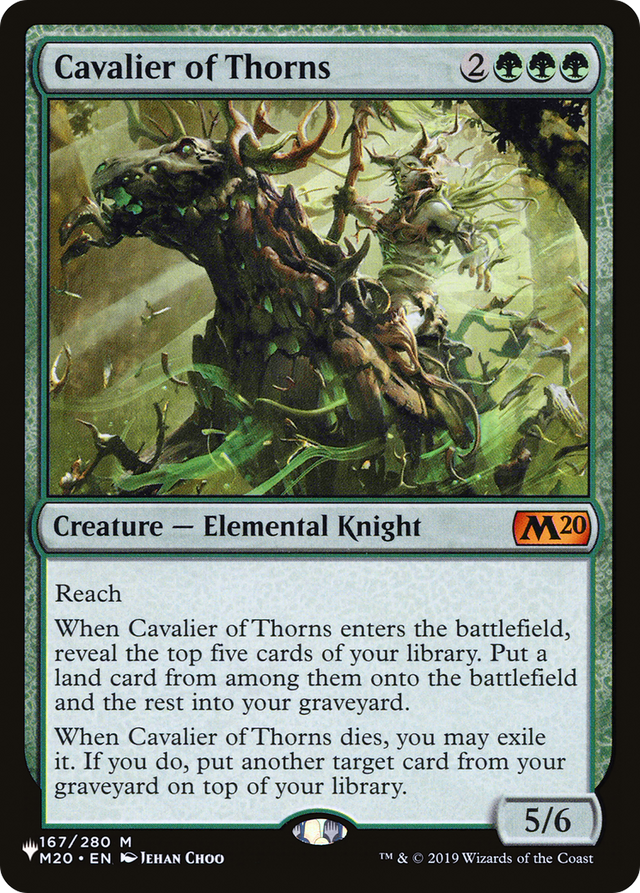 Reach When Cavalier of Thorns enters the battlefield, reveal the top five cards of your library. Put a land card from among them onto the battlefield and the rest into your graveyard. When Cavalier of Thorns dies, you may exile it. If you do, put another target card from your graveyard on top of your library.