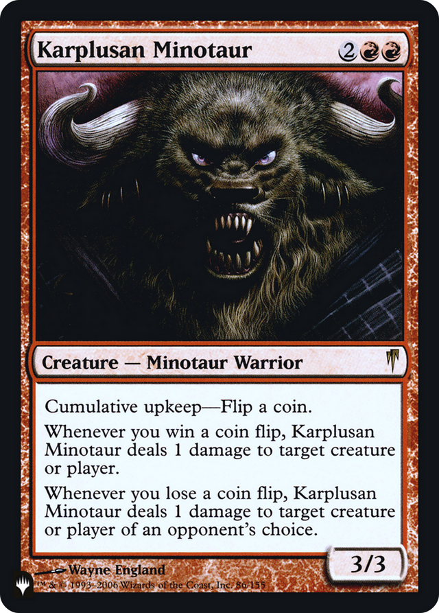 Whenever you lose a coin flip, Karplusan Minotaur deals 1 damage to any target of an opponent's choice.