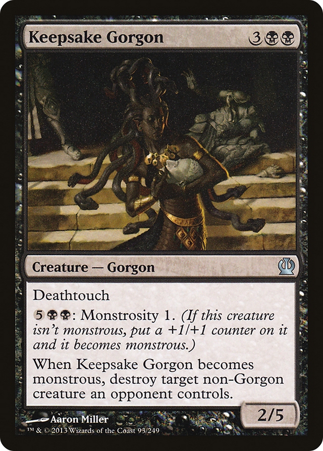 When Keepsake Gorgon becomes monstrous, destroy target non-Gorgon creature an opponent controls.