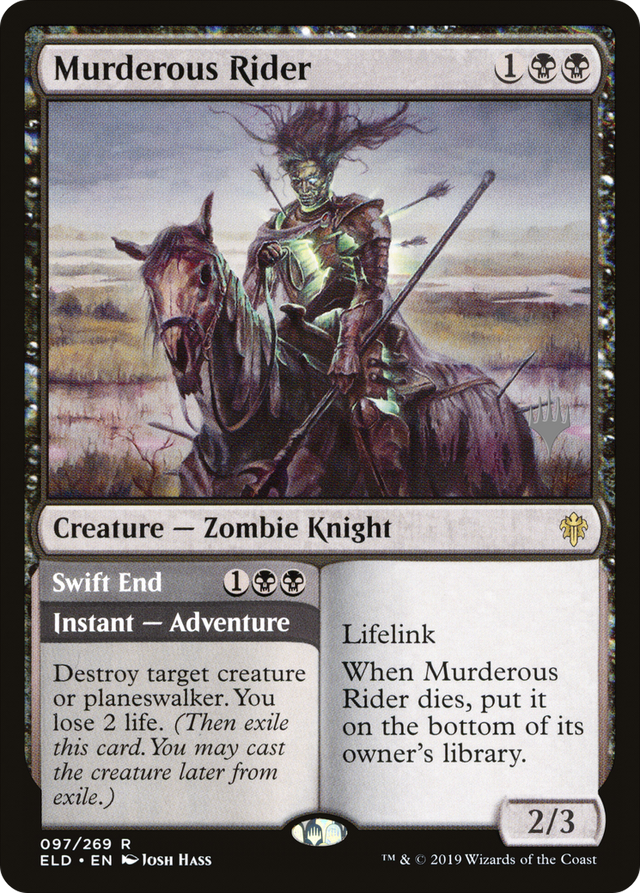 Lifelink When Murderous Rider dies, put it on the bottom of its owner's library. // Destroy target creature or planeswalker. You lose 2 life. (Then exile this card. You may cast the creature later from exile.)