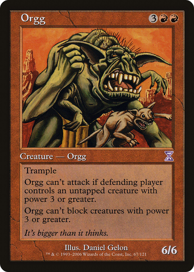 Orgg can't attack if defending player controls an untapped creature with power 3 or greater.