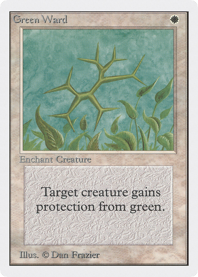 Enchanted creature has protection from green. This effect doesn't remove Green Ward.