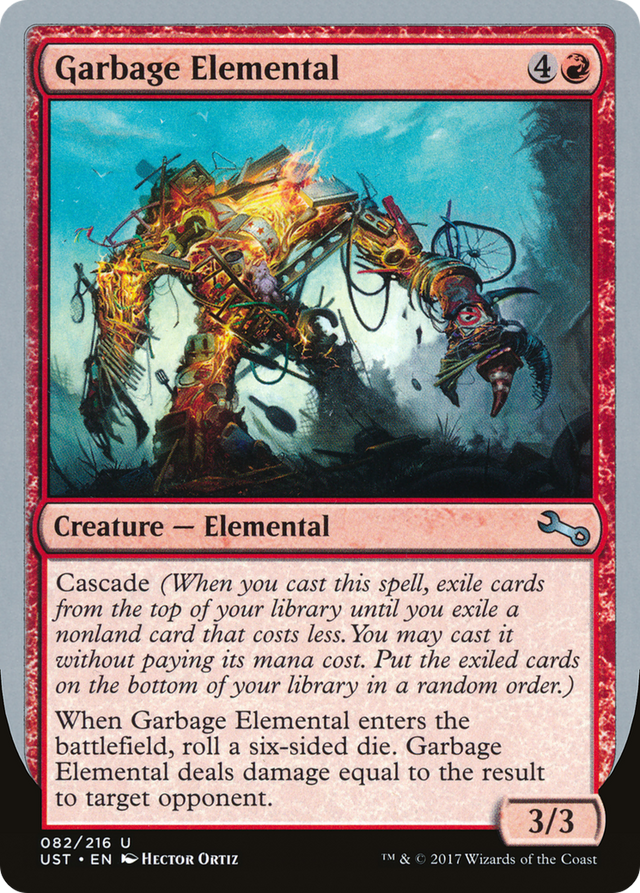 Cascade (When you cast this spell, exile cards from the top of your library until you exile a nonland card that costs less. You may cast it without paying its mana cost. Put the exiled cards on the bottom of your library in a random order.) When Garbage Elemental enters the battlefield, roll a six-sided die. Garbage Elemental deals damage equal to the result to target opponent or planeswalker.