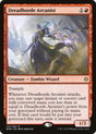 Whenever Dreadhorde Arcanist attacks, you may cast target instant or sorcery card with mana value less than or equal to Dreadhorde Arcanist's power from your graveyard without paying its mana cost. If that spell would be put into your graveyard, exile it instead.